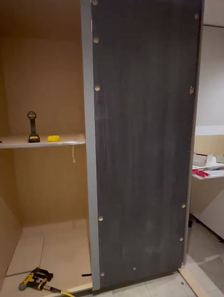 Some people may ask, "How do you conceal a water column?" Well, here's one way to do it. We added a shallow pantry that remains fully accessible from the inside. To maintain symmetry, we incorporated another pantry on the opposite side, ensuring a balanced and aesthetically pleasing design.